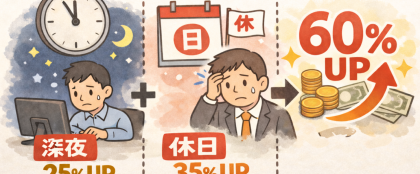 深夜かつ休日に労働した場合は、それぞれの割増が重なり、60%以上の割増となります。